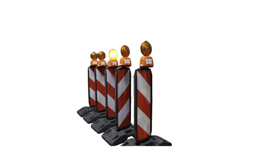 Baliza de obra con chevron a dos caras blanco/rojo ajustada a la base pesada universal de caucho negro de 28kg. Se pueden aplicar Focos destellantes, tanto en LED CASCADA L8M, como 12SuperLED 1 cara. SeñalConfor es una empresa de venta de señales de trafico y señalamiento vial. Para más información,…