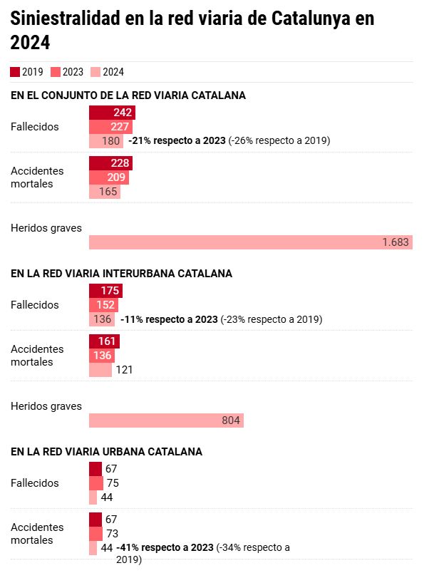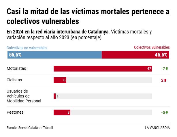 Por tipo de vehículos, las autoridades alertan del repunte de la siniestralidad de las furgonetas. 13 personas que viajaban en este medio de transporte fallecieron en la red viaria interurbana en Catalunya, mientras que en 2023 solo se contabilizó una víctima y nueve en el 2019. Por este motivo, el SCT realizará un refuerzo formativo para los conductores de furgonetas en cursos de recuperación de puntos de permiso. Por otro lado, se fomentará la información viaria en los centros de reconocimiento para las personas mayores de 65 años cuando vayan a renovar su permiso de conducir. La franja de edad con un mayor incremento en comparación con el 2023 es la de entre 65 y 74 años, con 17 víctimas, un 89% más. https://datawrapper.dwcdn.net/lzLY5/